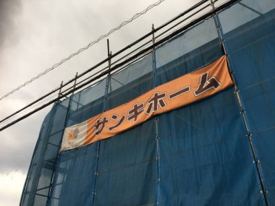 さて、下の写真は先日上棟したH様邸です!! サンキホームの看板を設置してあります