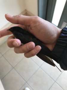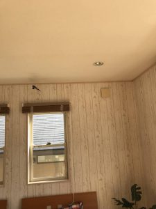 朝モデルハウスの清掃をします。モップがけをしている際にふと黒白紫が混じった塊が…鳥フン?