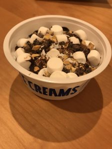 上にマシュマロとチョコが乗っていて下はチョコミントのアイスです