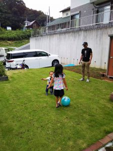 今まで、ずっと暑く、雨も続いたのでなかなかお庭で遊べなかったんです。と奥様からお話いただき、『なるほどdouble exclamation』元気に遊びたくなるよね~(*´ω`)と、私もサッカーに混ざってしまおうかと思いましたグッド (上向き矢印)グッド (上向き矢印)(*’▽’)