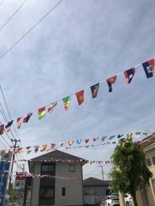 駐車場の上に付いている万国旗を新しいものに変えていただきました