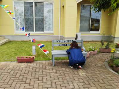 ベンチも千野社長の手作りです✨サンキホームに入社して体重が2キロ増えた私が座ってもびくともしませんし、カタカタしません