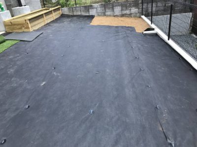 先ずは防草シート・その後人工芝の順です。(ホントは地面を平らに均したりとかあるみたいです。)