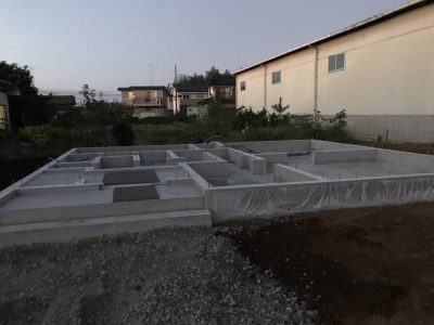 もうすぐ上棟予定の現場です。基礎が完成し、水道工事も進んでいます。