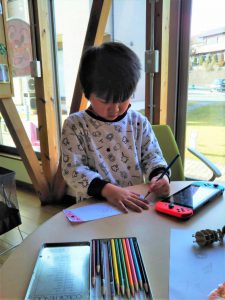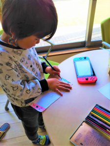 一緒にひらがなを書いたり、長島が描いたイラストをカタカナでSくんが答えを書くというゲームをしたりしましたが、Sくんがイラストを描いてくれました✐