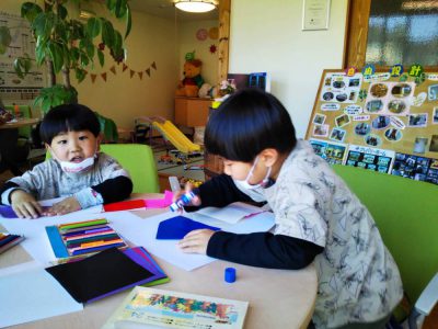 お打ち合わせ中のご夫婦の隣で何やら工作中の、HくんとAくん
