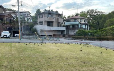 スズメじゃない、多分ムクドリでした。ひたすら何かついばんでいたので、きっと餌の何かが大量発生していたんだと思います。