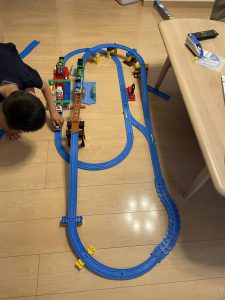 我が家に帰ると線路を作ります。立体交差がお気に入りです。