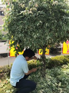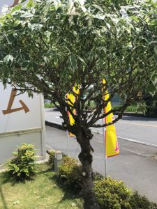 今日はモデルハウスの前の木を店長にカットしてもらいました美容院 (鋏)