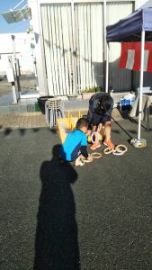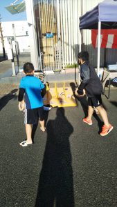 輪投げの競争をしているみたいです 自分たちでルールを決めて遊んでいます 子供は遊びの天才です