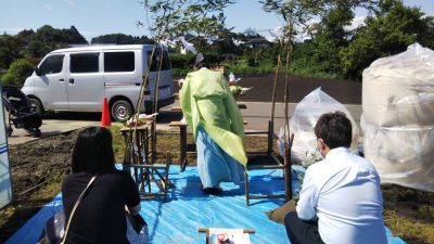 お昼頃降った土砂降りで、一時は地鎮祭が出来るかどうかドキドキしていましたが、全く心配いりませんでしたね