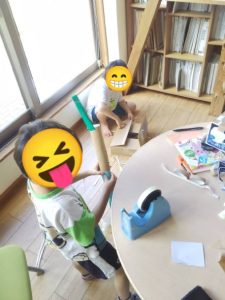 お打ち合わせでご来場いただきましたI様ご家族(^-^)打ち合わせ中、SくんとKくん国武店長と工作中✂