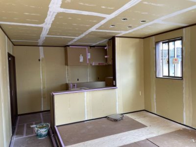クロス施工中の現場です。下地の石こうボードの接手に凹凸が無くなる様にパテ処理しています。ビスの穴全てにパテ処理を施しています。ちょっと気が遠くなる作業です。