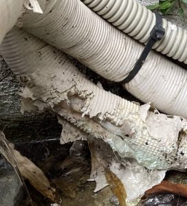 被覆材の破損状況をみると、何か動物にかじられた様な感じです。