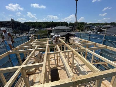 上棟の骨組み状態から素敵なキッチンのある、カッコイイお家に仕上がりました。