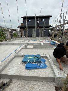 基礎が完成し大工さんが骨組みの一番最初の工程に入ります。