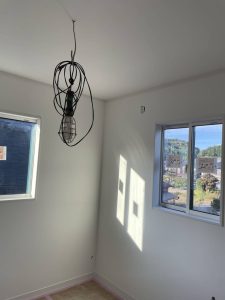いよいよ仕上げの工事が入ります。壁紙が貼られると一気に部屋になります。壁紙の後は電気(コンセントとかスイッチ)、トイレや化粧台等の設置でもうすぐ完成になります。