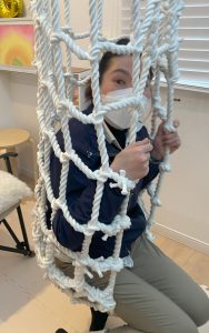 決して罠にハマって捕獲された訳ではありません。ブランコ的な感じで遊んでいます。