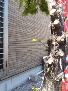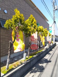 サンキホームのオープン時から歩道側一面に元気に育っているヒバの木を