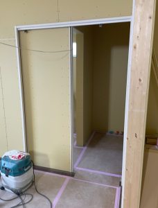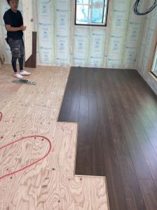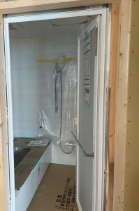 2階も床まで貼っています。お風呂も設置されました。次は階段が設置されている…かも