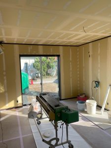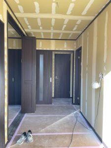 クロス工事がスタートしました。壁紙を施工する前に壁の凸凹を平に処理する工程です。この後に壁紙が施工されます。
