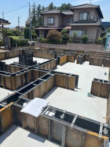 基礎工事も中盤です。今日はアンカーチェックです。図面通りの位置にセットされているか一本一本チェックです。