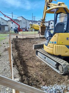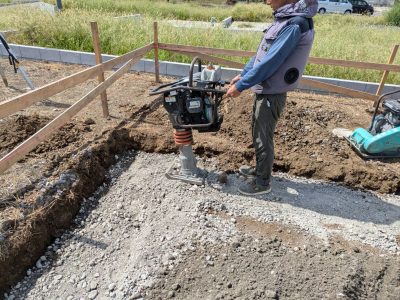 基礎工事が始まりました。基礎部分に砕石を敷いて転圧、この上に配筋組、その後コンクリートを打設していきます。