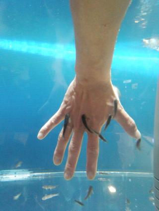 知っている方もいると思いますが、 『ドクターフィッシュ』 っていう人の角質を食べてくれる魚みたいです 手を入れてみると近寄ってきて、ツンツンツンツンツンと 突っつきながら食べるんです それがまたくすぐったくて思わず手に力が入っちゃいましたが、 慣れてくると変に気持ち良かったり 魚の数が少なかったのでもっと多ければ良かったなと思いましたが、 貴重な体験をしてきました なんだか手がスベスベするのは気のせいかな