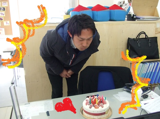 勘付いているとは思いつつサプライズバースデーをするため こみやんとたっしーはそわそわしながら、たまたま来ていた若松さんにも お手伝いしていただき無事サプライズ?でお祝いできました♪
