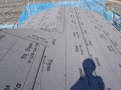 先日上棟したT様邸の屋根です。防水の下葺きまで施工しています。これで雨が降っても...