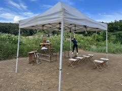 こんにちは 国武です 週末イベントリーダーがテント下で涼んでいます すごい麦わら...
