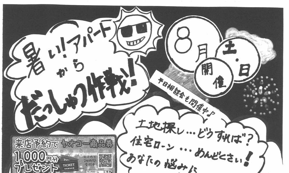 暑い!アパートからだっしゅつ作戦! 8月の土・日 開催 平日相談会も開催中!! 土地探し・・・どうすれば? 住宅ローン・・・めんどうくさい! あなたの悩みに私たちサンキホームのスタッフがトコトン向き合います … 続きを読む 暑い!アパートからだっしゅつ作戦!
