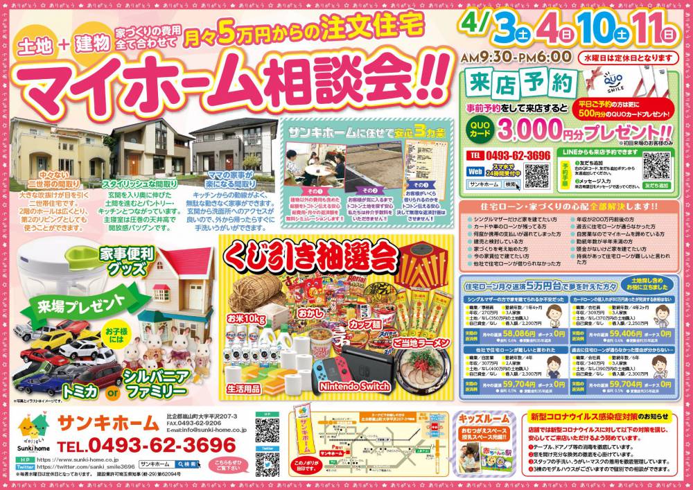 来店予約プレゼント クオカード3,000円分 イベント マイホーム相談会!! 日時 4.3(土)~ 4.11(日) 開催場所 埼玉県比企郡嵐山町平沢207-3