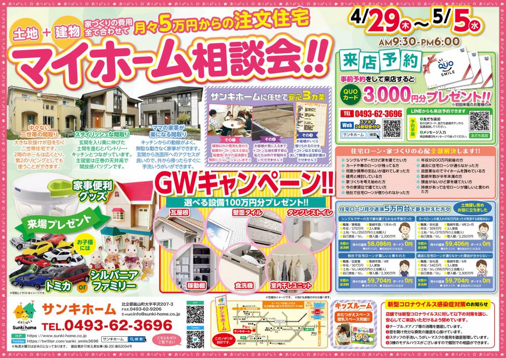 来店予約プレゼント ヤオコー商品券3,000円分 イベント マイホーム相談会 開催 日時 4.29(木)~ 5.5(水) 開催場所 埼玉県比企郡嵐山町平沢207-3