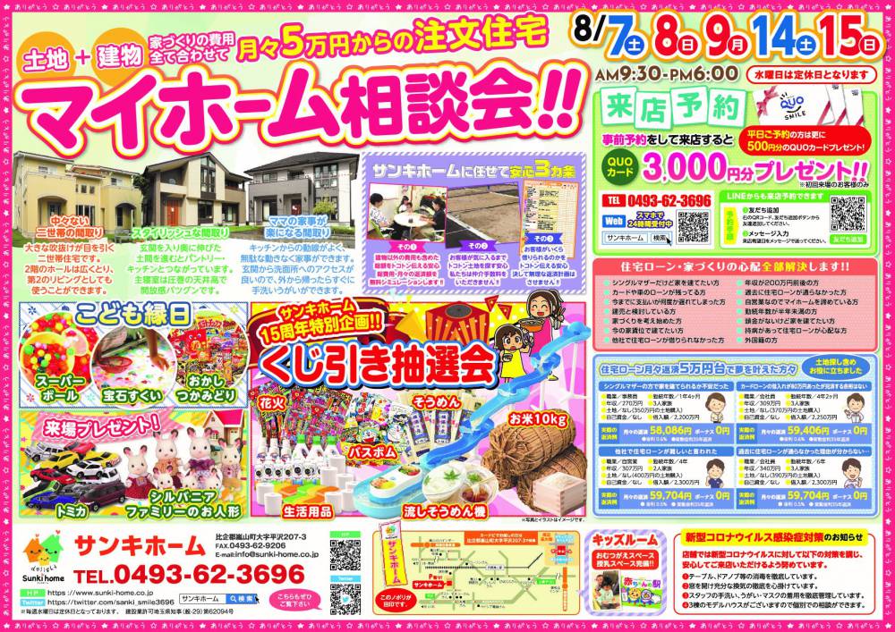 来店予約プレゼント クオカード3,000円分 イベント マイホーム相談会!! 日時 8.7(土)~ 8.15(日) 開催場所 埼玉県比企郡嵐山町平沢207-3
