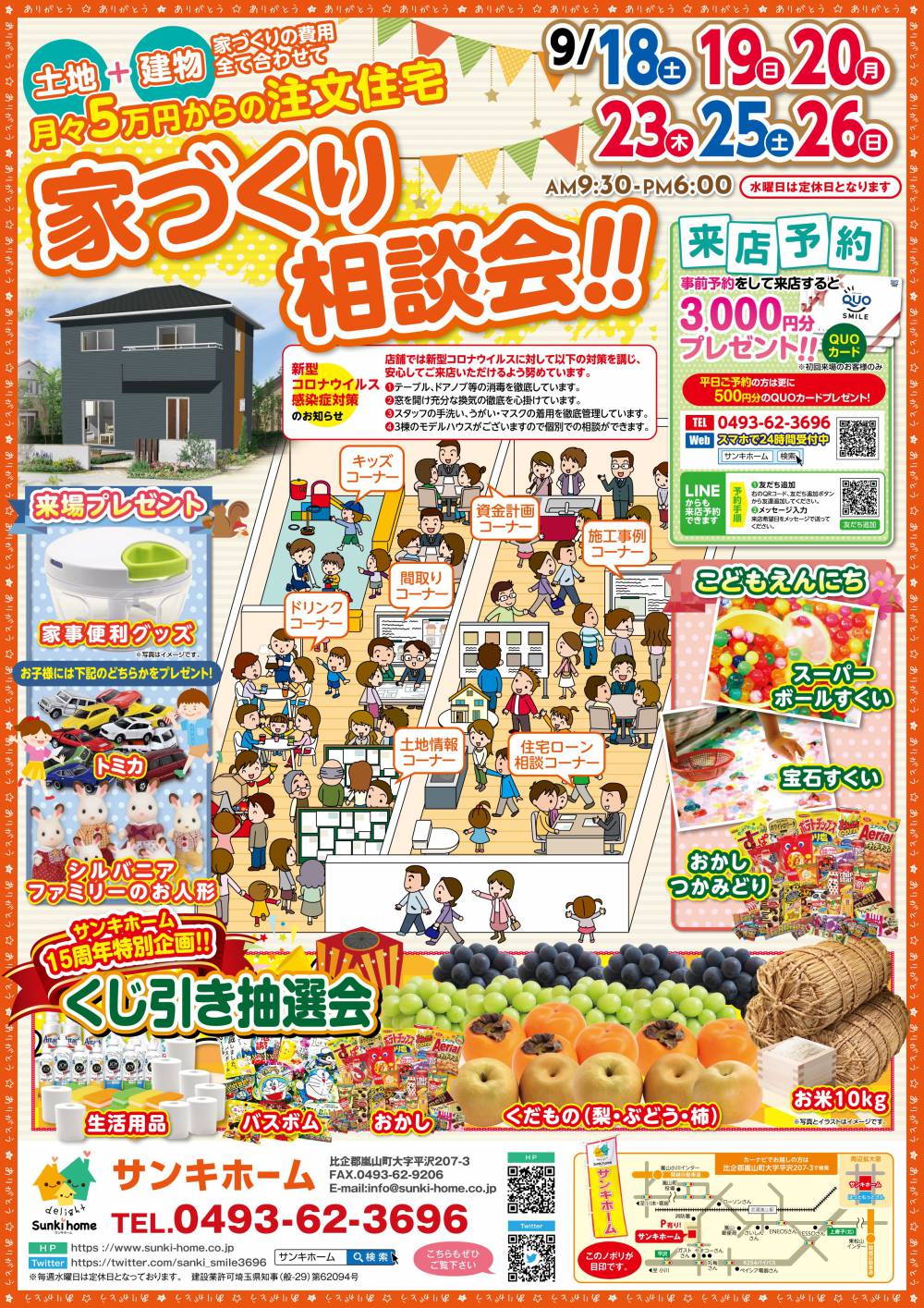 来店予約プレゼント クオカード3,000円分 イベント 家づくり相談会 開催!! 日時 9.18(土)~ 9.26(日)  開催場所 埼玉県比企郡嵐山町平沢207-3