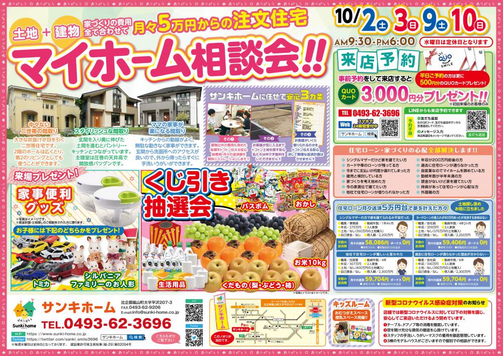 来店予約プレゼント クオカード3,000円分 イベント マイホーム相談会!!開催 日時 10.2(土)~ 10.10(日) 開催場所 埼玉県比企郡嵐山町平沢207-3