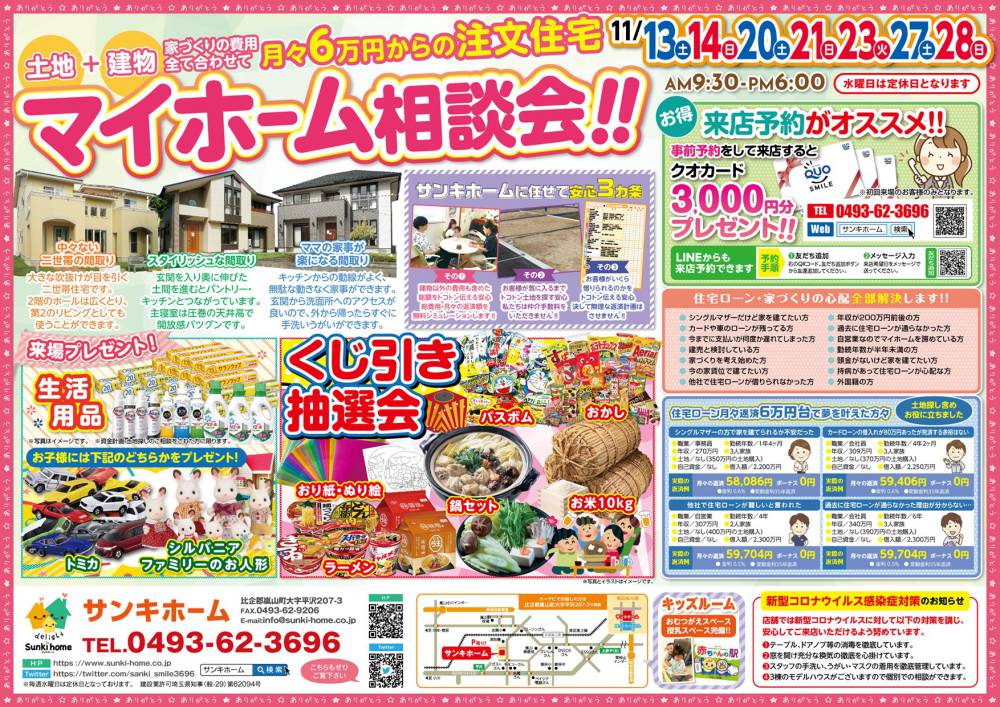 来店予約プレゼント クオカード3,000円分 イベント マイホーム相談会!!開催 日時 11.8(月)~ 11.28(日) 開催場所 埼玉県比企郡嵐山町平沢207-3