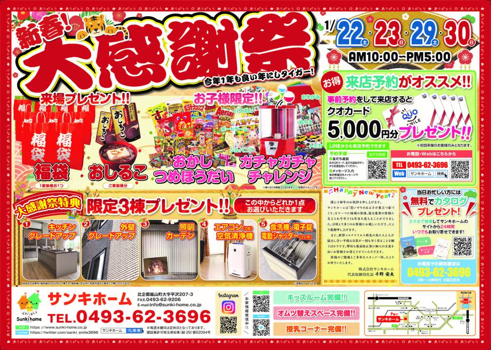 来店予約プレゼント クオカード5,000円分 イベント 新春大感謝祭 日時 1.29(土)~ 1.30(日) 開催場所 埼玉県比企郡嵐山町平沢207-3