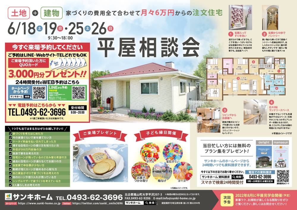 来店予約プレゼント クオカード3,000円分 イベント 平屋相談会 開催 日時 6.13(月)~ 6.26(日) 開催場所 埼玉県比企郡嵐山町平沢207-3