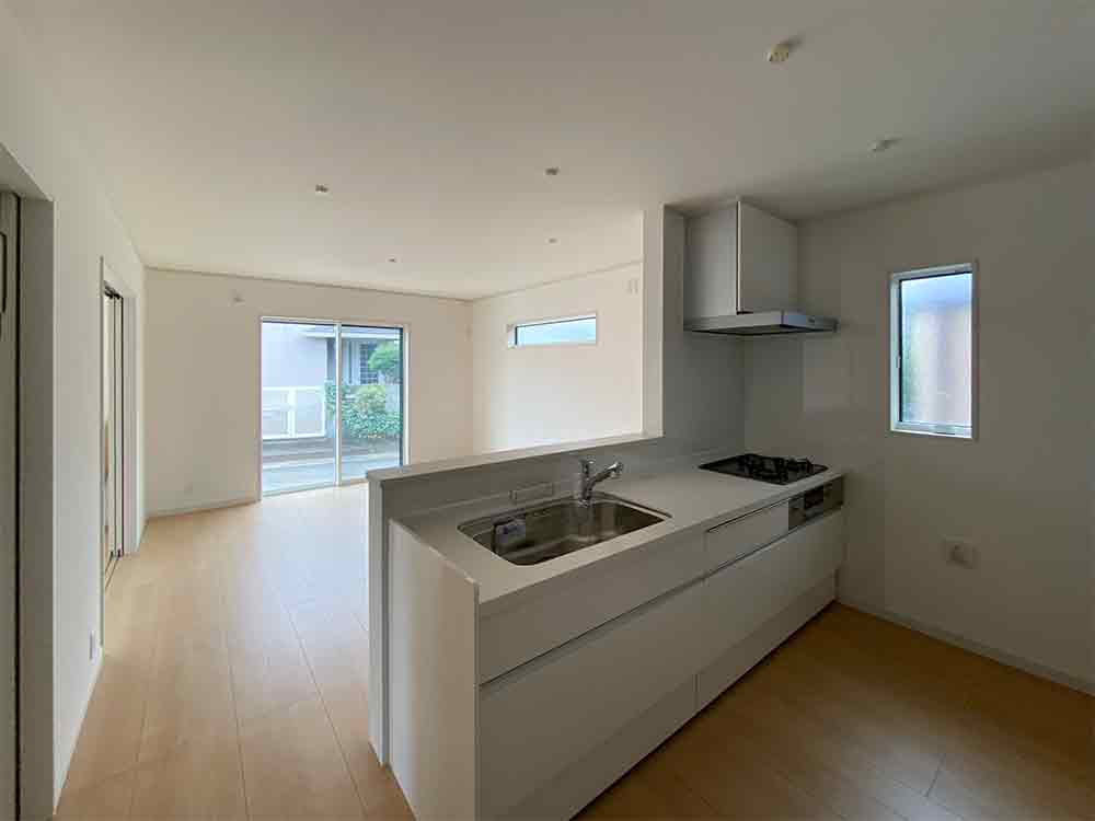 キッチンの隣を通ってリビングへ。『何か手伝うよ!』と声がかけやすくなる家族思いの動線です。
