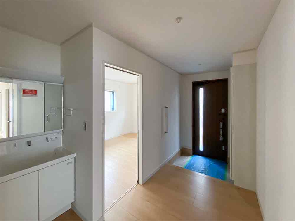 広々玄関ホールで買い物帰りも家族渋滞なくストレスフリー。また、玄関からすぐに手洗い・うがいが出来るようにもなり、脱衣所から洗面台を分離させることでゆったりとしたスペース感を感じます。