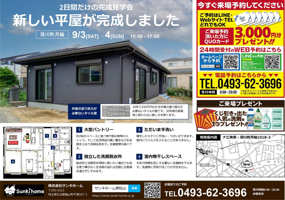 来店予約プレゼント クオカード3,000円分 イベント 【平屋】OPEN HOUSE(滑川町月輪) 日時 8.27(土)~ 9.4(日)  開催場所 滑川町月輪1018-3