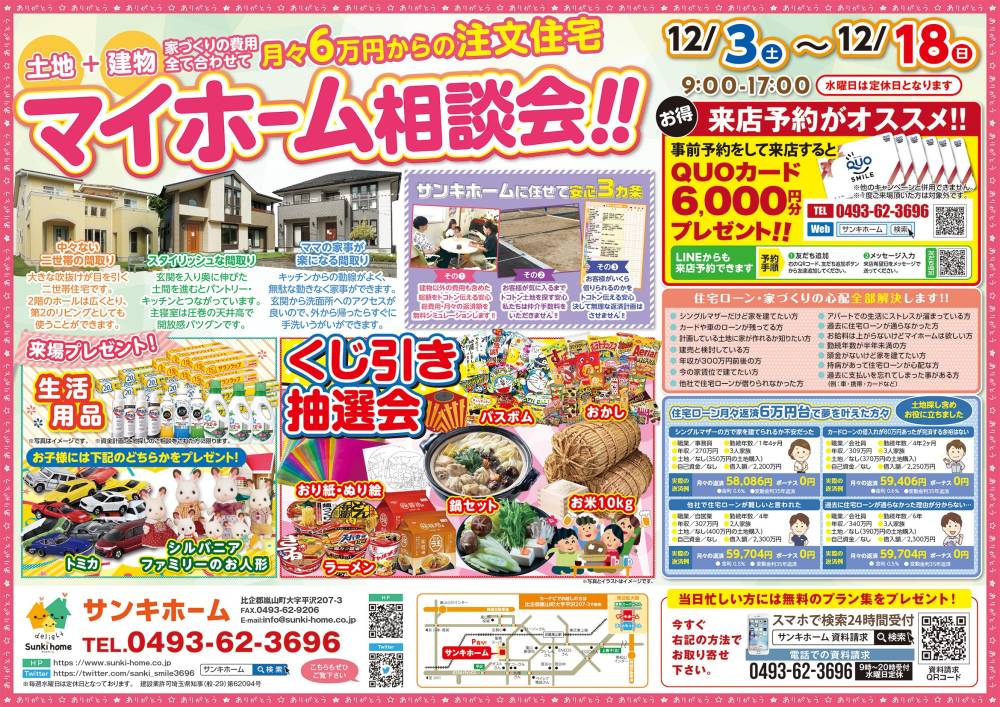 来店予約プレゼント クオカード6,000円分 イベント マイホーム相談会!! 日時 12.3(土)~ 12.18(日) 開催場所 埼玉県比企郡嵐山町平澤207-3