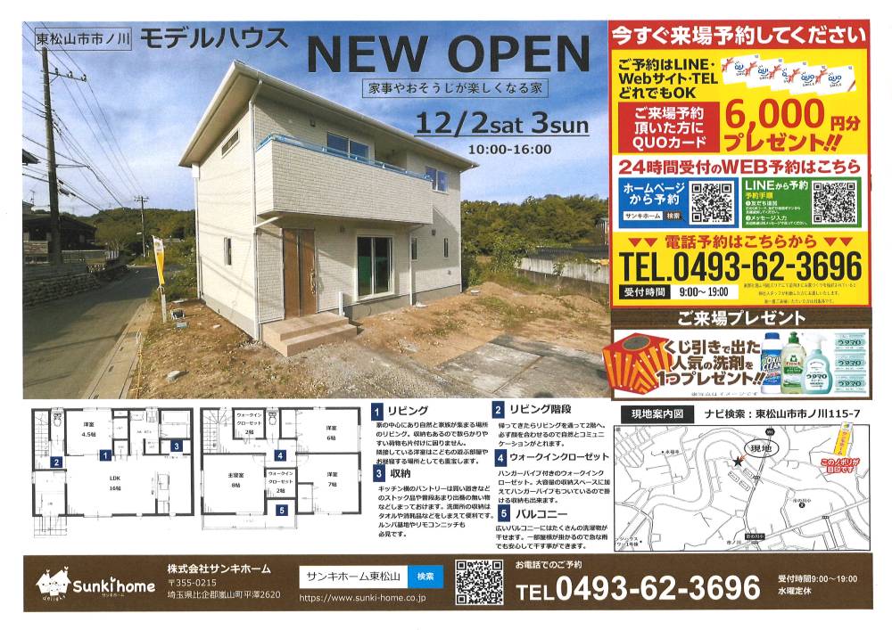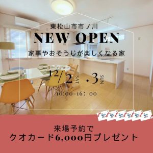 来店予約プレゼント クオカード6,000円分 イベント 東松山市市ノ川モデルハウスNEW OPEN 日時 12.2(土)~ 12.3(日) 開催場所 埼玉県東松山市市ノ川115-7