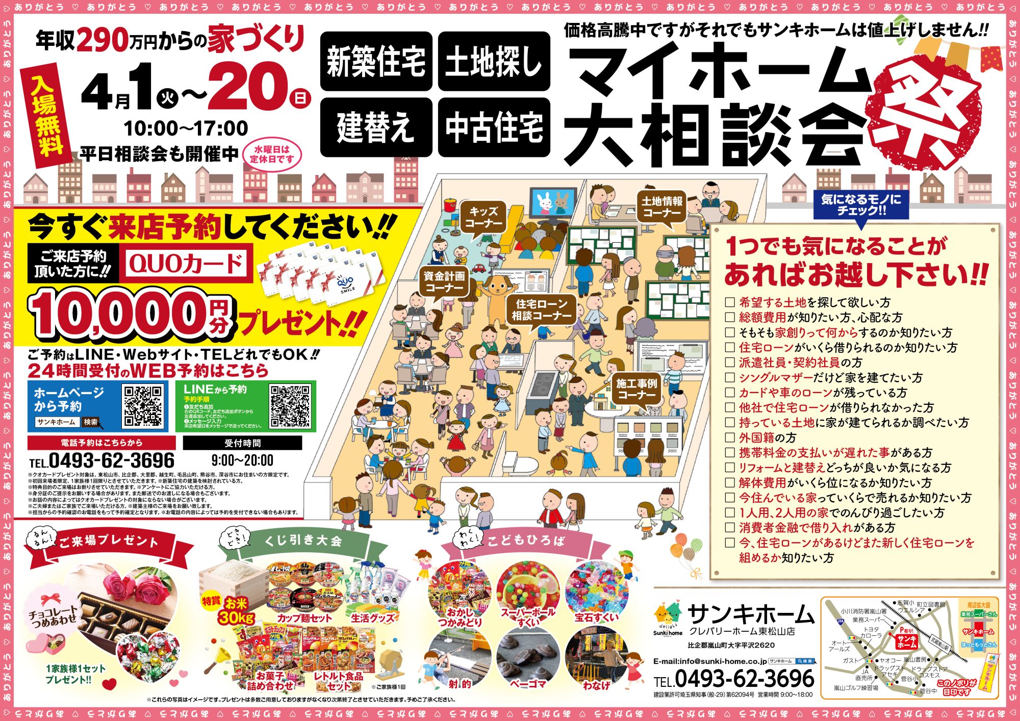 来店予約プレゼント クオカード10,000円分 イベント マイホーム大相談会!! 日時 4.1(火)~ 4.20(日) 開催場所 埼玉県比企郡嵐山町平澤2620