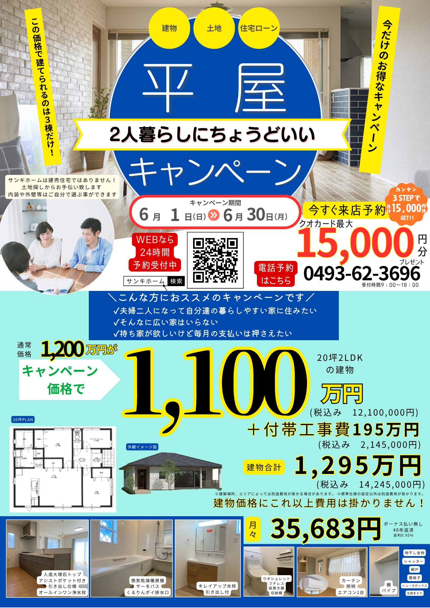 来店予約プレゼント クオカード15,000円分 イベント 平屋相談会 日時 6.10(火)~ 6.30(月) 開催場所 埼玉県比企郡嵐山町平澤2620