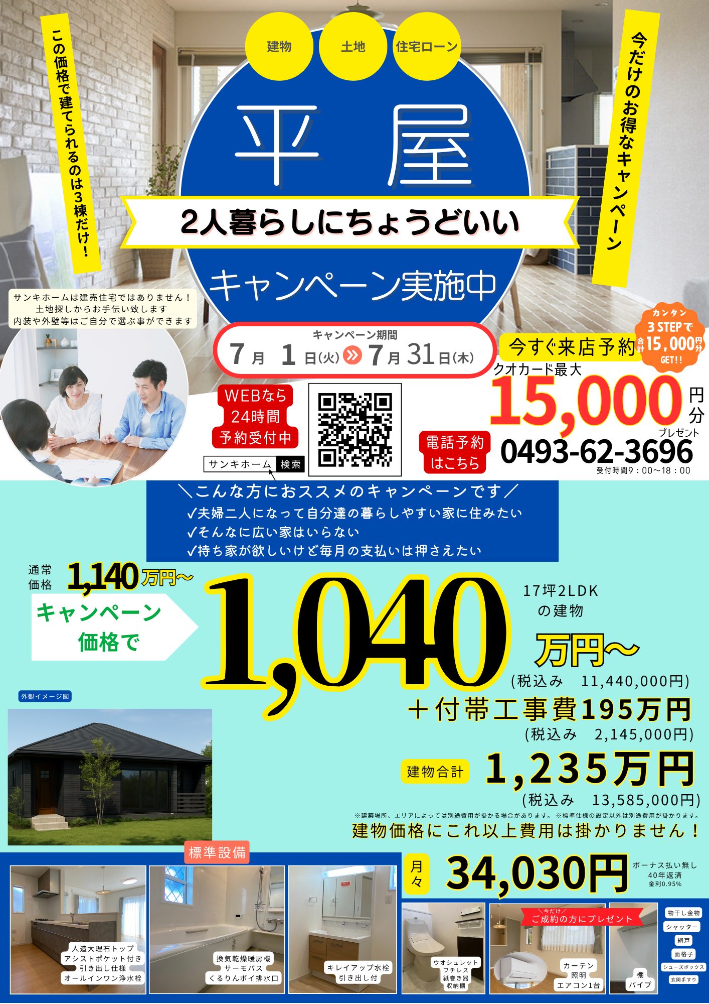 来店予約プレゼント クオカード15,000円分 イベント 平屋相談会 日時 7.1(火)~ 7.31(木)  開催場所 埼玉県比企郡嵐山町平澤2620