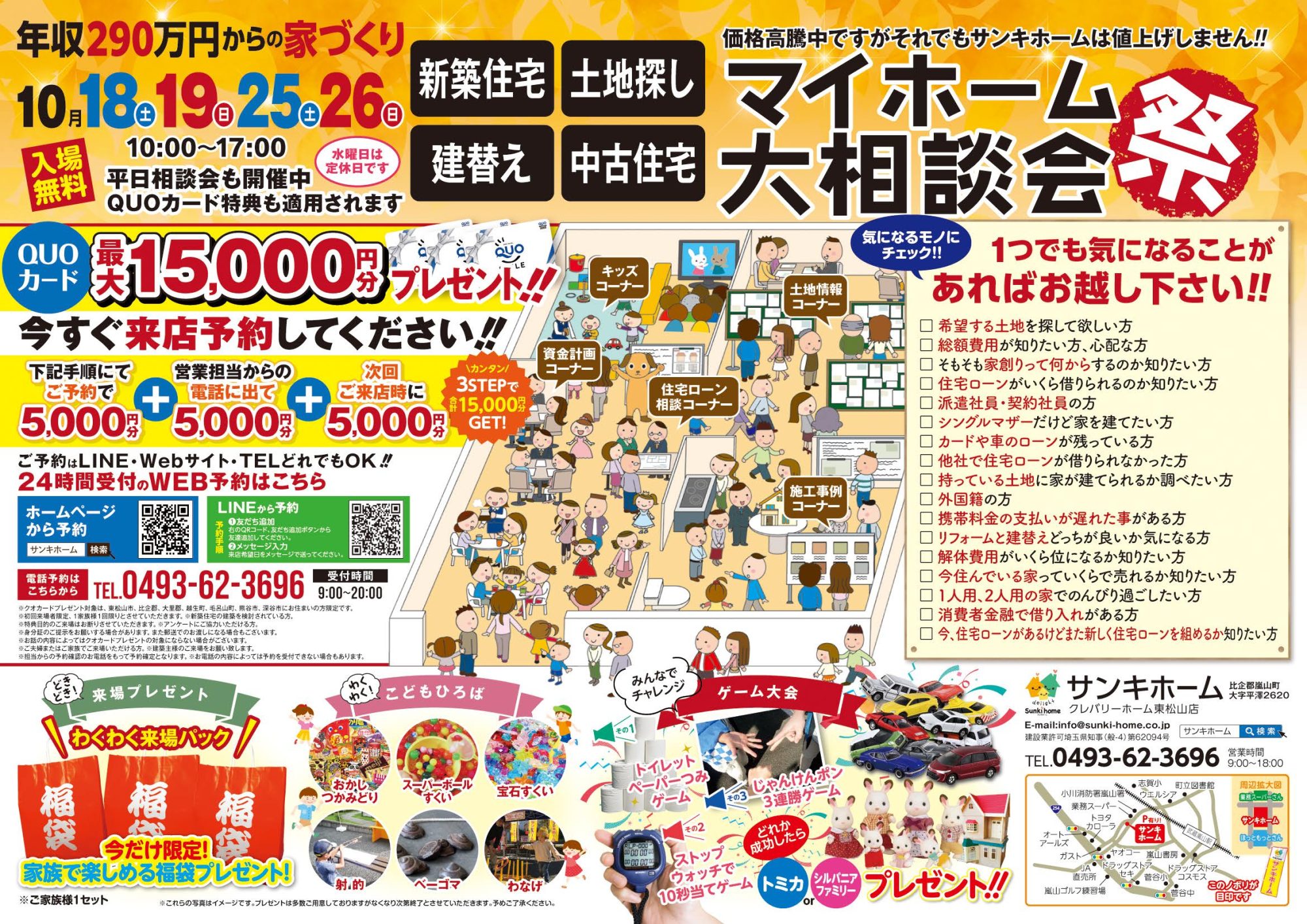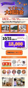 来店予約プレゼント クオカード15,000円分 イベント 10月マイホーム大相談会 日時 10.14(火)~ 10.31(金) 開催場所 埼玉県比企郡嵐山町平澤2620