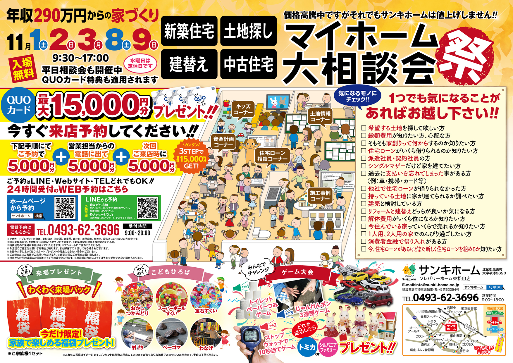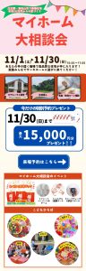 来店予約プレゼント クオカード15,000円分 イベント マイホーム大相談会 日時 11.1(土)~ 11.9(日) 開催場所 嵐山町平澤2620